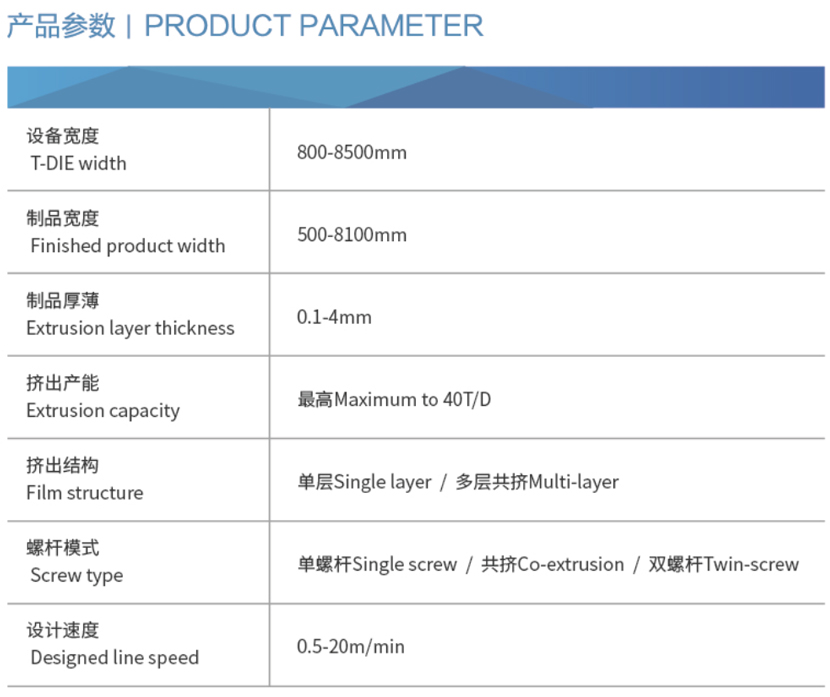 設備按制品結構所需可選擇單層/多層共擠等工藝,還可裝備還可裝備原料自動(dòng)計量配料系統,多工位自動(dòng)收卷系統、瑕疵檢測、在線(xiàn)測厚、全自動(dòng)調節模具、在線(xiàn)分切、卸卷稱(chēng)重、遠程維保系統等功能件。